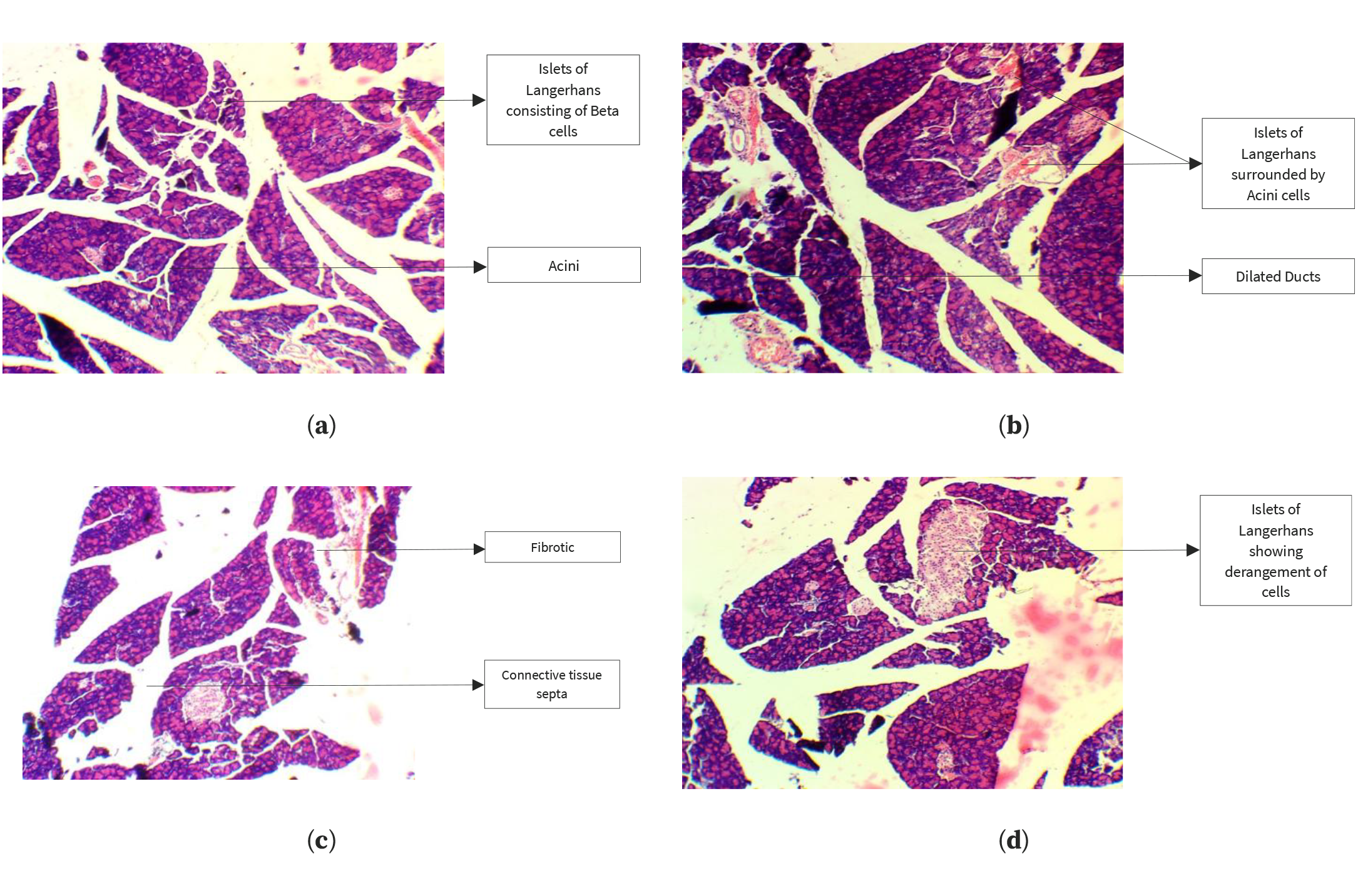 Figure 2. Histopathological analysis of the pancreas in the control group (a), HFrD group (b), kaempferol-treated group (c), and quercetin-treated group (d).