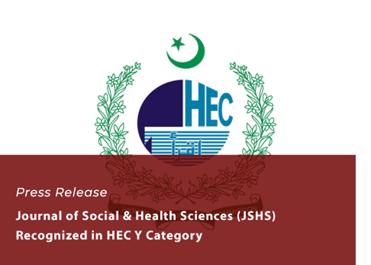 The Journal of Social & Health Sciences (JSHS) is pleased to announce its official recognition in the ‘Y’ Category by the Higher Education Commission (HEC) Pakistan, effective November 5, 2025, as per Notification No. 15-54/Coord/2019/R&ID/HEC/876 issued under the updated HEC Journals and Publications Policy 2024.